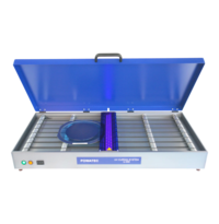 By using LEDs instead of traditional means, there are numerous advantages that are gained including longer lifetime, lower maintenance costs, no warm-up time, and no ozone gas or dangerous mercury gas generation. In contrast to common mercury vapor lamp systems, this device does not require a long warm-up time and is ready for use immediately upon being turned on. Also, with the use of our potentiometer, the conveyor speed and thus the exposure time can be precisely adjusted according to the specification of the UV film. With the U-300 and its 72 high powered LEDs, an adjustable dose between 145 and 1520 mJ/cm2 per working cycle can be achieved. Higher doses can be achieved by exposing the substrate a second time immediately after the first pass.