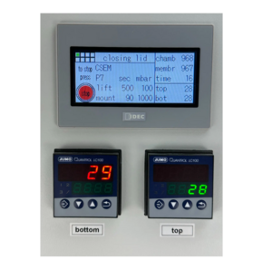 The V-150 SiC supports processes that require the top chuck (used to heat the tape) and the bottom chuck (used to heat the wafer) to be set to different temperatures during the mounting process. Dual displays mounted on the front of the device show the current temperature of each chuck and the target temperature set by the user. The device will only begin the mounting process once each chuck reaches the target temperature.
